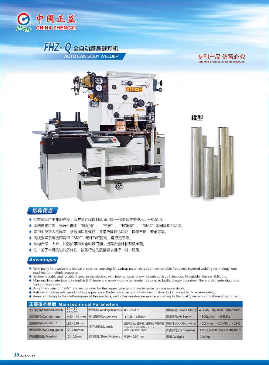 生产能力Production capacity50~80cans/min适用材质Materials镀锡马口铁、镀锌板、镀铬板、不锈钢板Tinplate,Zinplate, TFS,Stainless steel sheet适用罐径Can diameterφ52~99mm板料厚度Sheet thickness0.16~0.30mm适用罐高Can height165~305mm供给电源Power supply40kVA/三相/3P AC 380V/50Hz焊接速度Welding speed12~24m/min压缩空气Compressed air>800L/min,>0.5MPa焊缝搭接量Overlap0.4,0.6mm冷却水Cooling water>20L/min,>0.4MPa,<18℃焊接频率Welding frequency80~260Hz外形尺寸Dimension1720(L)×1900(W)×2270(H)mm铜丝直径Copper wireΦ1.38~1.50mm重量Weight2200kg结构优点: